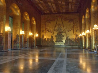 En el famoso Salón Dorado se efectúa la Fiesta de Gala después de la cena. Entrar a este salón es como entrar a un Palacio de Las mil y una noches, o a un pequeño castillo decorado con arte bizantino. El artista Einar Forseth, con tan solo 28 años, diseñó este magnífico salón inspirado en las iglesias sicilianas. Las paredes están forradas con 18 millones de pedacitos de mosaico y oro laminado de 23,5 quilates. En total, hay 10 kilos de oro empotrados en esos muros que muestran al espectador lugares y personajes de Suecia, pero también del extranjero. Los dibujos revelan la historia de Estocolmo en particular y de Suecia en general. En la pared del norte hay un dibujo del rey sueco Erik Jerdvardsson sentado en un caballo y con la cabeza cortada. Este fallo, dicen los entendidos en la materia, se debe a un mal cálculo de la altura del techo. Jerdvardsson reinó durante el período 1156 -1160, y nunca fue canonizado por el papa. Sin embargo, era considerado como un santo porque en su reinado los impuestos eran justos y las leyes se aplicaban con imparcialidad. Lo irónico de esta historia es que Jerdvardsson murió cuando un enemigo le cortó la cabeza.