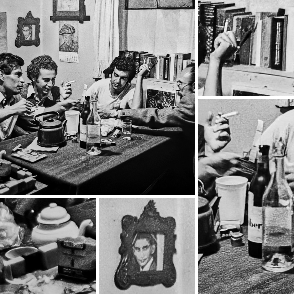 Consultado por El Duende, acerca de cuándo y dónde fue tomada la fotografía, Eduardo Mitre cuenta: El fotógrafo es el reconocido Hugo Estenssoro, que un día me llamó para decirme que radicaba en Nueva York, y que deseaba tomarme unas fotos. Concertamos el encuentro en Madison Square Park, donde me tomó varias. Luego me dijo que tenía un obsequio para mí, y envuelto en un sobre acolchado me entregó la fotografía en cuestión. Hugo la había tomado décadas atrás, en 1979 –año en que se publicó Mirabilia– , en una de tantas veladas o trasnochadas (como se ve, copiosamente rociadas pero invariablemente bien conversadas) que tuvimos en el apartamento de Jesús Urzagasti. En su estudio de Manhattan, Hugo acababa de descubrirla al revelar los varios rollos que de antaño guardaba sin que vieran la luz. Así, una cadena de propicios azares y coincidencias traza la historia de esa foto que conservo en la sala, posada en una repisa cubierta con un bordado, junto a otros objetos muy queridos. En la foto misma puede verse, colgada de la pared, con marco medio barroco, una fotografía de Kafka, tan venerado por nuestro genial escritor.