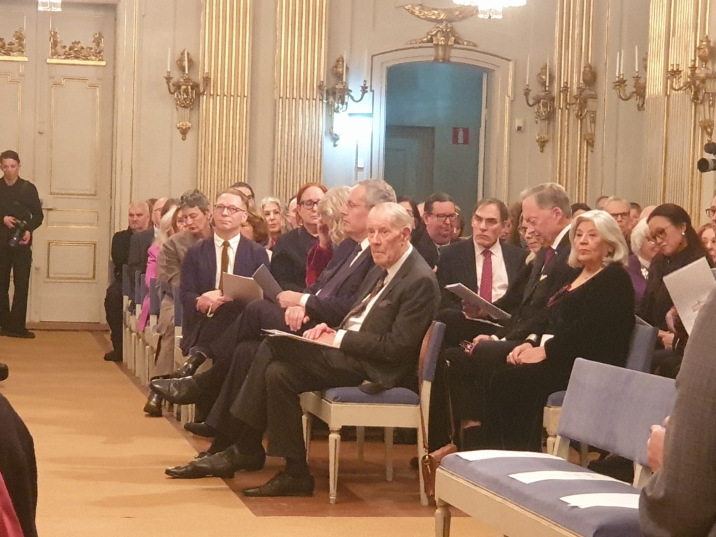 Cada 7 de diciembre de cada año, exactamente a las cinco de la tarde, este mismo lugar se vuelve escenario de uno de los rituales más solemnes de la cultura occidental: el discurso del Premio Nobel de Literatura en el salón de la Academia Sueca. Llegué a este local 45 minutos antes de que empezará el acto. Luego de pasar el estricto control, me dirigí a la guardarropía, dejé mi abrigo y entré al salón. En un costado había un pequeño estante con folletos que contenían el discurso de Krasznahorkai en tres lenguas: sueco, inglés y húngaro. El ambiente era de expectación contenida. Casi todos los asientos ya estaban ocupados, y se oían conversaciones en voz baja, un murmullo que se apagaba lentamente.