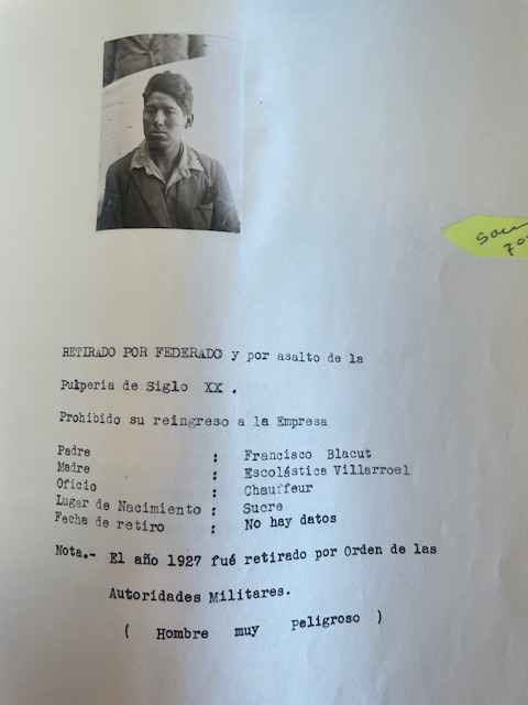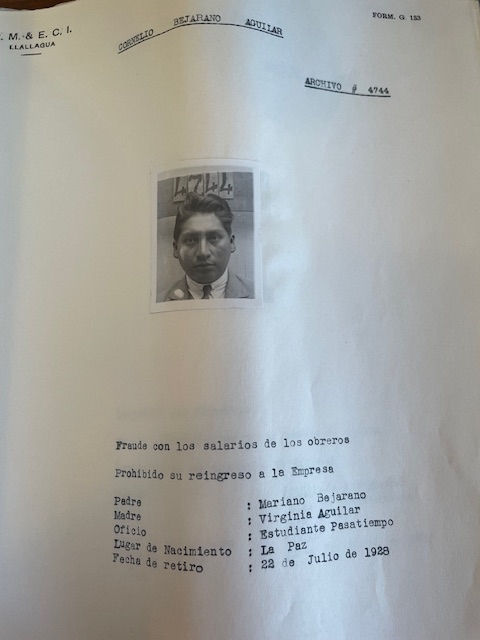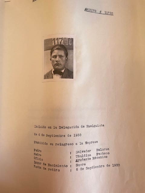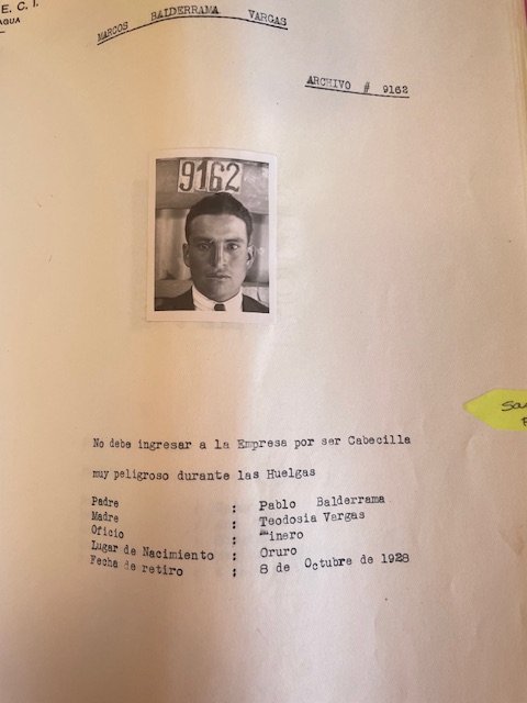 Por ejemplo, Celestino Baina Morales, con número de archivo 9142. En la parte inferior de su fotografía, se lee: “Incluido en la delegación de los huelguistas de fecha 6 de septiembre de 1930. Prohibido su reingreso a la empresa. Padre: Nicanor Baina, Madre: Manuela Morales. Oficio: Labrador. Lugar de nacimiento: Itapaya (Cochabamba) Fecha de retiro: 6 de septiembre de 1930”