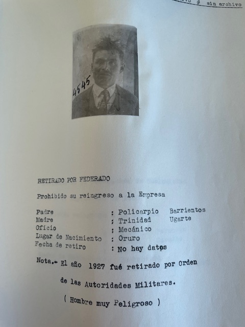Juan de Dios Barrientos Ugarte, Retirado por federado; prohibido su reingreso a la empresa. Padre: Policarpio Barrientos, Madre: Trinidad Ugarte. Oficio: Mecánico. Lugar de nacimiento: Oruro. El año 1927 fue retirado por orden de las Autoridades Militares (Hombre muy Peligroso).